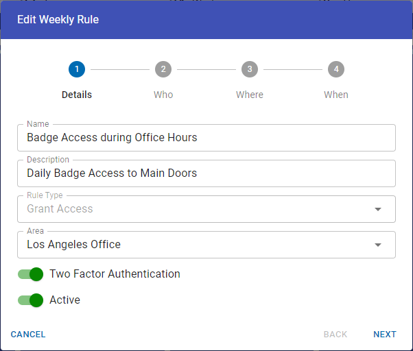Once two-factor authentication is globally enabled, navigate to the Weekly Rules page by clicking the Access Control button on the left navigation bar. From here you can either edit an existing rule or add a new rule to use two-factor authentication.