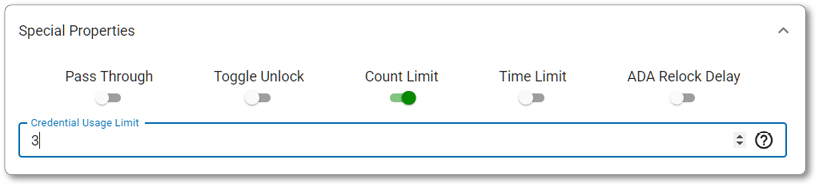 Count Limit is used to limit how many times a credential may be used. After the credential is preseted for the set number of times, it will become inactive.