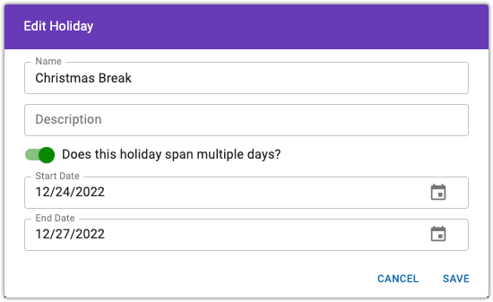 - From the weekly or monthly calendar views, click on the holiday to bring up the information pop-out, then click