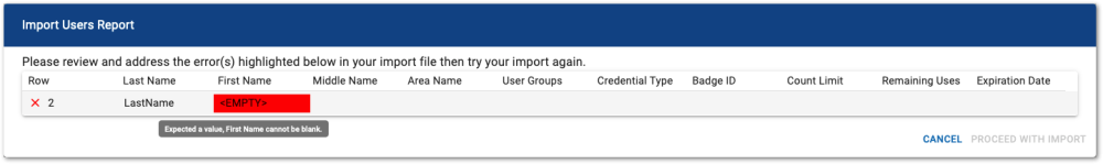 - Ensure that the area(s) already exist in Pure Access. The user import will not create new areas. If an AreaName cell is populated with an area that does not exist in Pure Access, the import will fail.