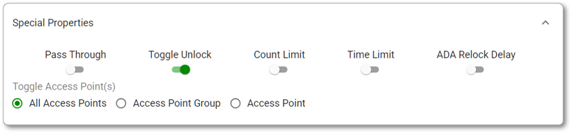 Note: If you select an access point group in Step 5, each door in the group will need to be toggled individually. You cannot use a credential to toggle an entire group of access points with a single presentation.
